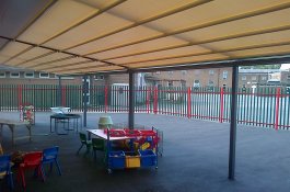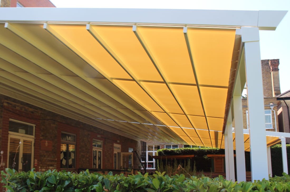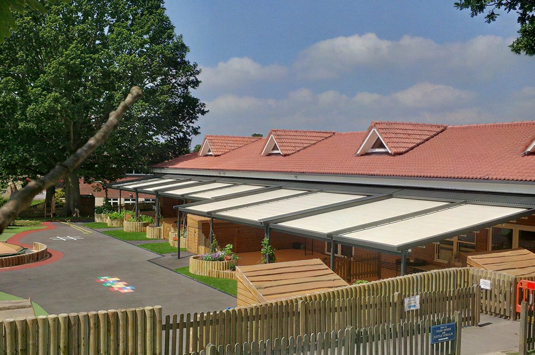 For a more permanent solution to use all year round, Broadview supply and install the popular Sunrain system. This is a rigid framed outdoor structure has a fully retracting roof to allow schools to easily regulate light and shade. Every model is motorised with market leading Somfy motors with 5 year guarantees. The maintenance is straightforward which is always a huge benefit to school property managers.