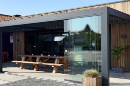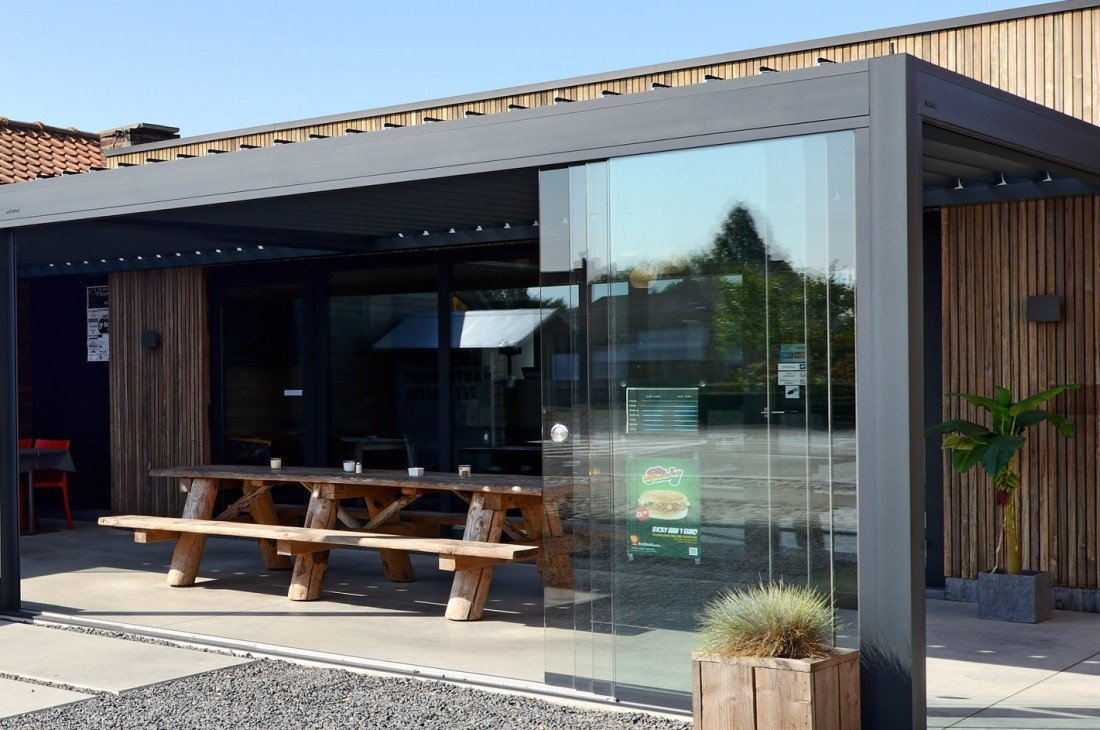 Personalise your outdoor structure with high-quality sliding glass that protects you in all weather conditions. Available for all Brustor B200, B600 and Sunrain structures, our glass screens have a minimal, stylish, and classic appearance that will suit any business style. The glass screen’s aluminium tracks and glass carriers can be powder coated in any RAL colour by our experts, to ensure they can perfectly match your outdoor structure that promises continuity in style.