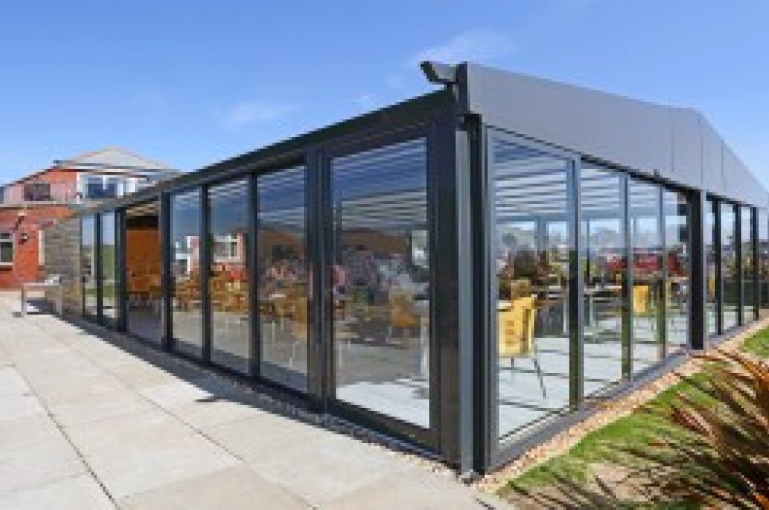 Personalise your outdoor structure with high-quality sliding glass that protects you in all weather conditions. Available for all Brustor B200, B600 and Sunrain structures, our glass screens have a minimal, stylish, and classic appearance that will suit any business style. The glass screen’s aluminium tracks and glass carriers can be powder coated in any RAL colour by our experts, to ensure they can perfectly match your outdoor structure that promises continuity in style.